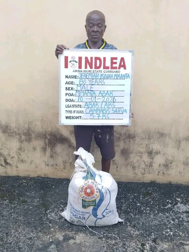 Notorious for illicit drug business, Nkanta was first arrested by NDLEA on 14th December 2022, prosecuted and sentenced to two years in jail by a Federal High Court in Uyo, Akwa Ibom state. Not ready to let go the old habit, Nkanta returned to the illicit drug trade and following credible intelligence, NDLEA operatives on Saturday 10th January 2025 tracked the Octogenarian ex-convict to his Mmanta – Abak village, Abak local government area of Akwa Ibom state, where he was arrested with 5.7 kilograms of skunk, a strain of cannabis in his residence.