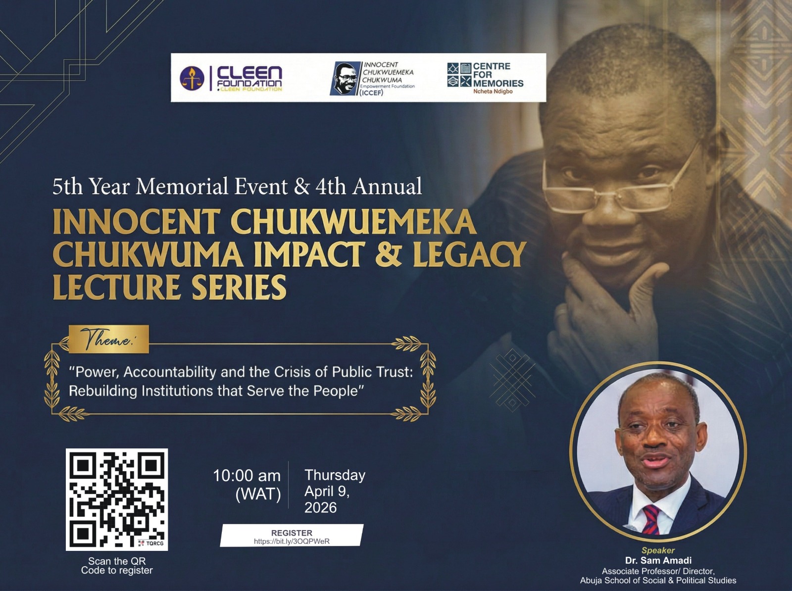 The CLEEN Foundation, in partnership with the Innocent Chukwuemeka Chukwuma Empowerment Foundation (ICCEF) and Centre for Memories, is hosting the 5th Year Memorial Event and the 4th Annual Innocent Chukwuemeka Chukwuma Impact & Legacy Lecture on April 9, 2026, in Enugu. This event honors the late human rights advocate and police reform champion, Innocent Chukwuemeka Chukwuma, and features a lecture by Dr. Sam Amadi, Associate Professor at the Abuja School of Social and Political Studies, on contemporary governance challenges and reformist leadership in Nigeria.