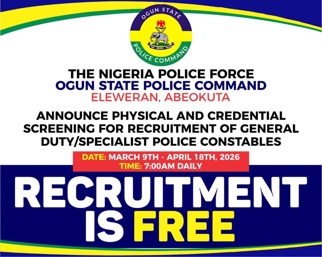 The Ogun State Police Command has announced that the physical and credential screening exercise for the recruitment of General Duty and Specialist Police Constables will take place from March 9 to April 18, 2026, at POWA Hall, Command Headquarters, Eleweran, Abeokuta, Ogun State.