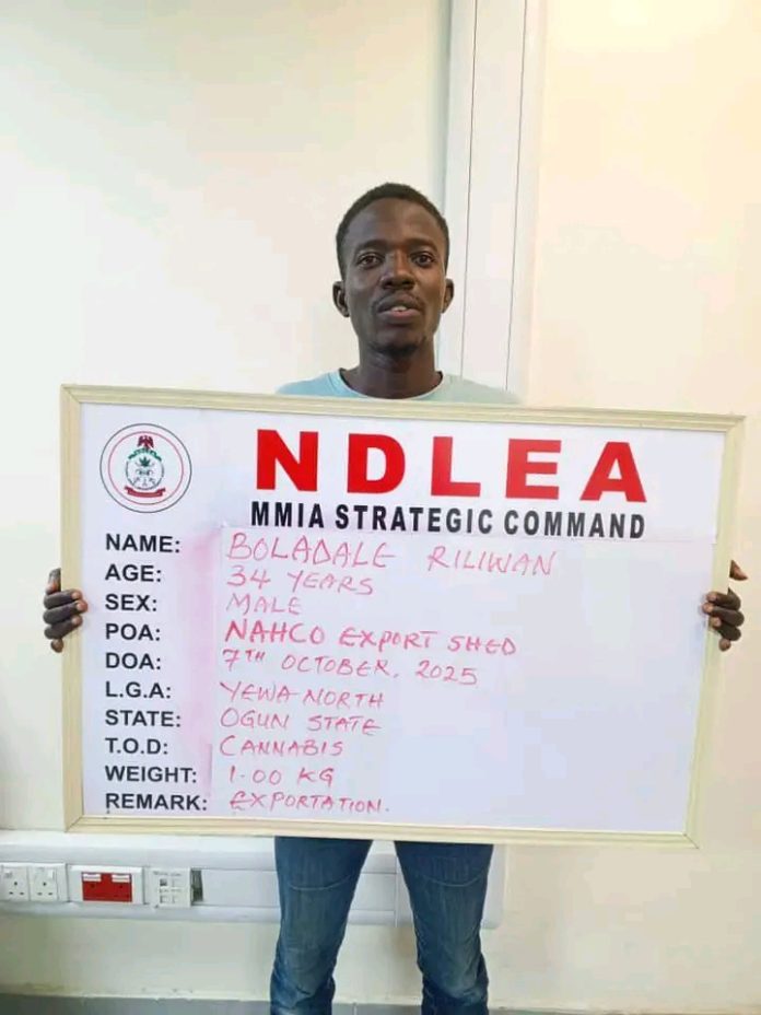 At least, two suspects linked to attempts to export the illicit substances have already been taken into custody. One of them, a cargo agent Boladale Riliwan was arrested on 7th October 2025 following the discovery of 15 parcels of skunk, a strain of cannabis, concealed in 10 pieces of giant rechargeable electrical bulbs he presented in a carton for airfreight to Democratic Republic of Congo (DRC) at the export shed of the Lagos airport.